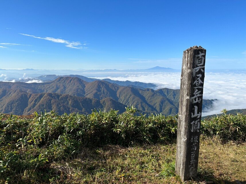 真昼岳山頂に到着~!眼下には雲海と目線の先には鳥海山も見えています。頑張って歩いてきて良かった~!!