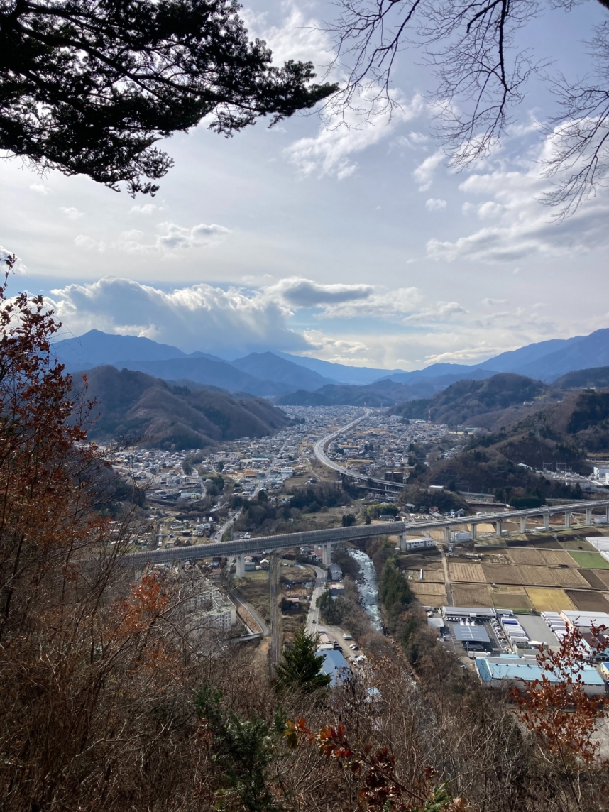 登り始めて30分。リニアと高速道路、そして富士山がきれいに見えるビュースポットに到着。