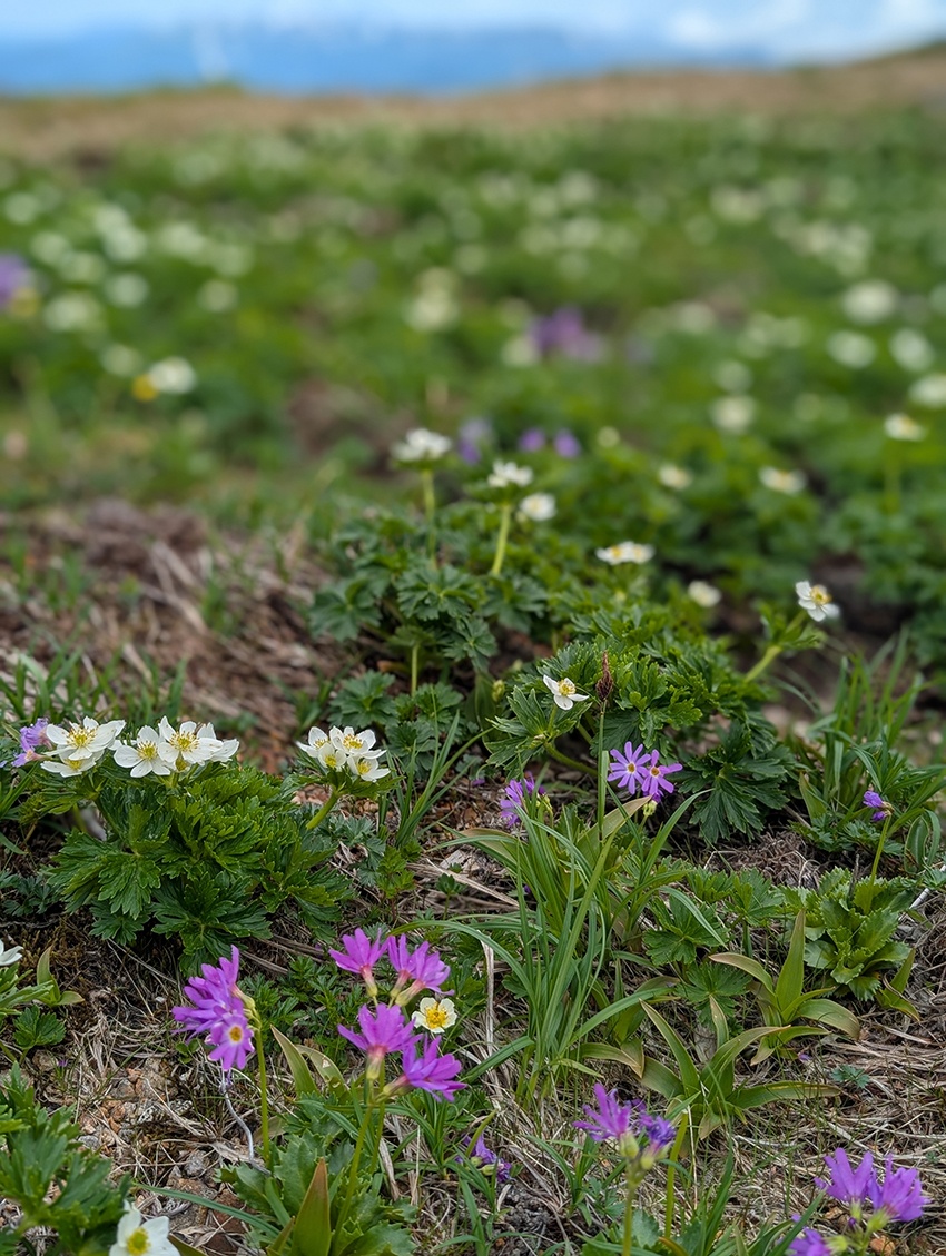 稜線上にいっせいに咲き誇る高山植物の大群落